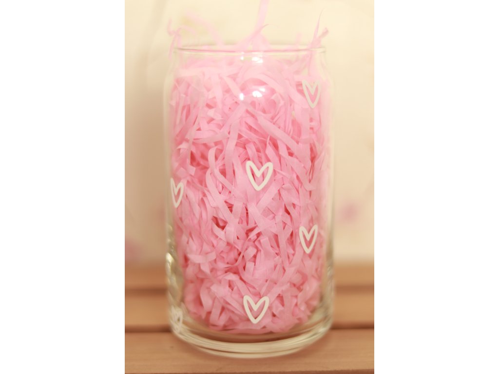 Sklenička ve tvaru plechovky s vinylovým polepem JEMNÝCH BÍLÝCH SRDÍČEK.